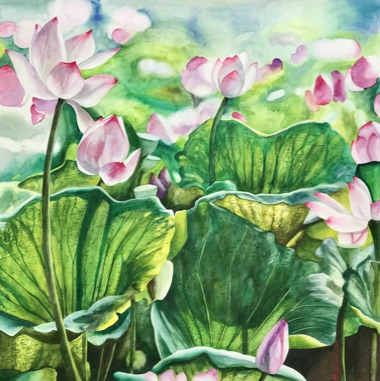 This watercolor shows the beauty and colorful atmosphere of the nympheas