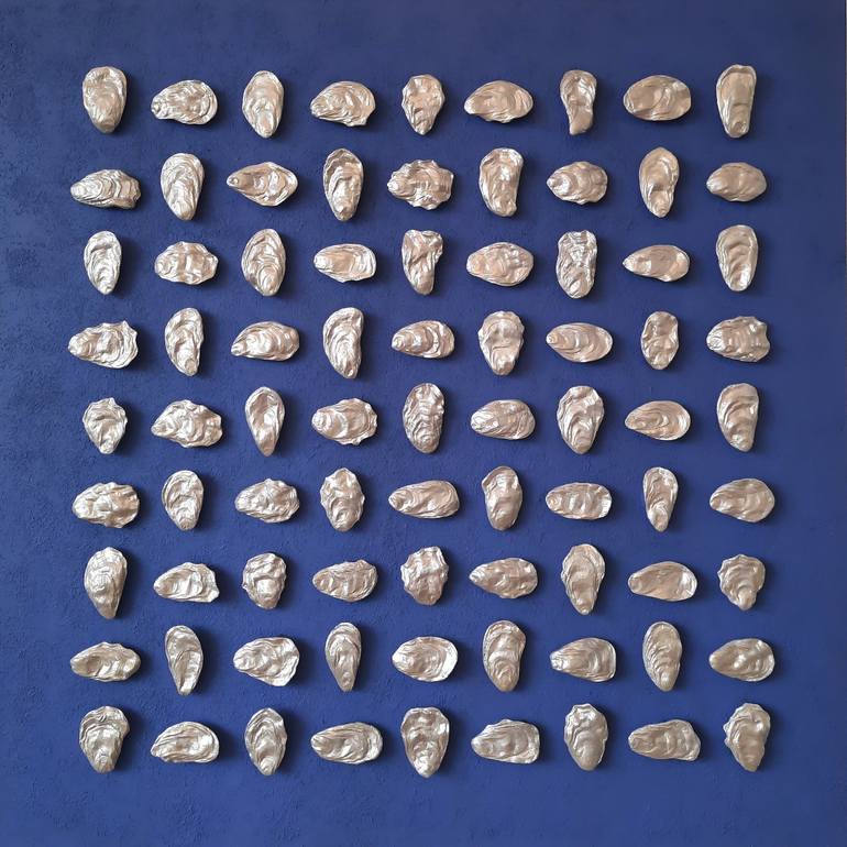 A minimalistic composition of prepared silver oyster shells on a blue plywood background