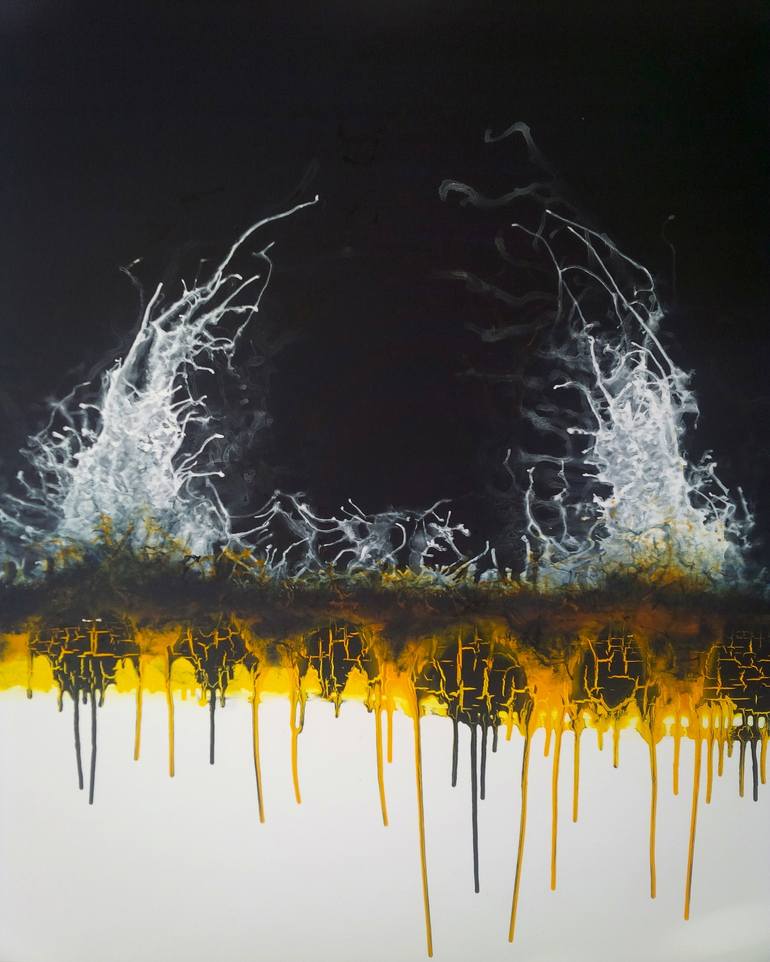 From the series " ON O IS " Transfering universal energies, abstract and expressiv throughout acrylics, as well as a fine grade of semi-precious-stone pigment (lapis lazuli & spinel yellow) other mineral pigments and waterglass silicate up to the canvas.