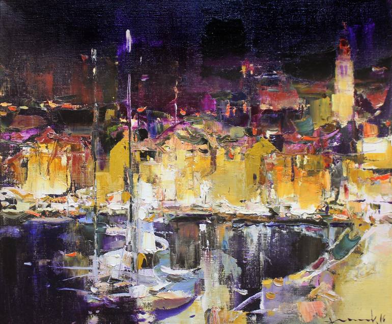 Croatia. Postira. ships in port. evening in the port city. evening cafes. Cocktail of the dark sky and light in the port