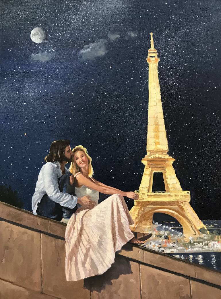 Original description "The Eiffel Tower" Size 45x60 cm 2023 I painted this romantic picture on Valentine's Day. The moon, the starry sky, Paris and two lovers at the Eiffel Tower, this is exactly the plot that appeared in my imagination on this wonderful day. Paris is a city of love, and the Eiffel ...