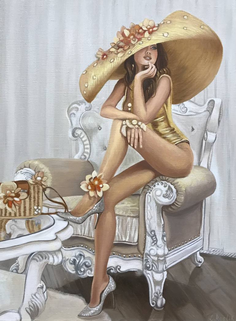 Original description "The girl in the hat" Size 45x60 cm 2023 I have always admired the beauty of the female body and I really wanted to convey it on my canvas. To draw this portrait, I was inspired by a charming girl in a hat, playful, flirtatious and a little mysterious. I wanted to show the perf...