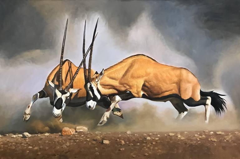 Original description "Two Oryxes" Size 120x80 cm 2022 I painted this picture after my trip to Africa and received inspiration from seeing the beauty of the nature and animal world. The plot of this work looks very lively and dynamic. I tried to convey all the beauty and power of these fighting anim...