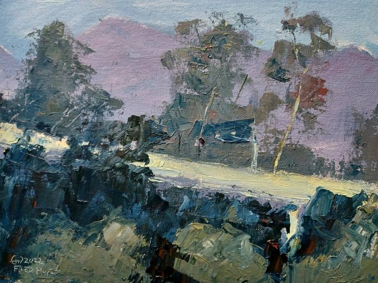 "Oaks & Eucalyptus 210 Freeway" captures a familiar California scene. This original oil painting presents a view of a freeway offramp and sign, as seen from Desiderio Park in Pasadena. The artist's impressionistic style beautifully depicts the local landscape. Painted with oil on a quality canv...