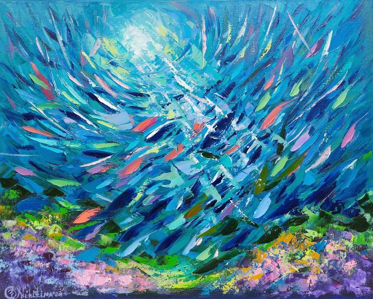 This vibrant oil painting on canvas, created with expressive palette knife strokes, captures the dynamic beauty of the underwater world. Inspired by the artist's scuba diving experiences, this artwork reflects a mesmerizing scene where light, shapes, and colors intertwine in an explosion of movement...