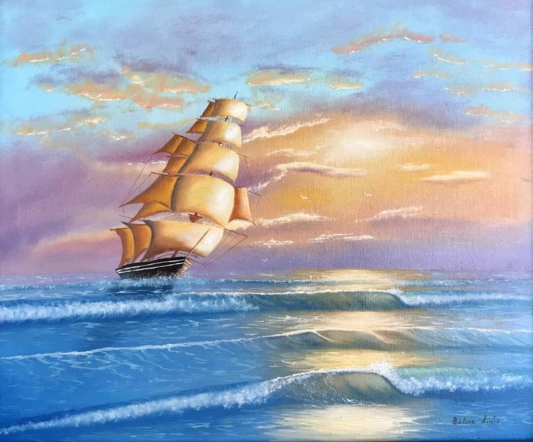 Tall ship at sunset. Original and handmade. Oil on canvas. The sea has attractive power, even if it is painted in oil. This painting is proof of this. A realistic image of the elements forces us to consider the details to the smallest detail: splashes of waves breaking on the ship's hull, white foam...
