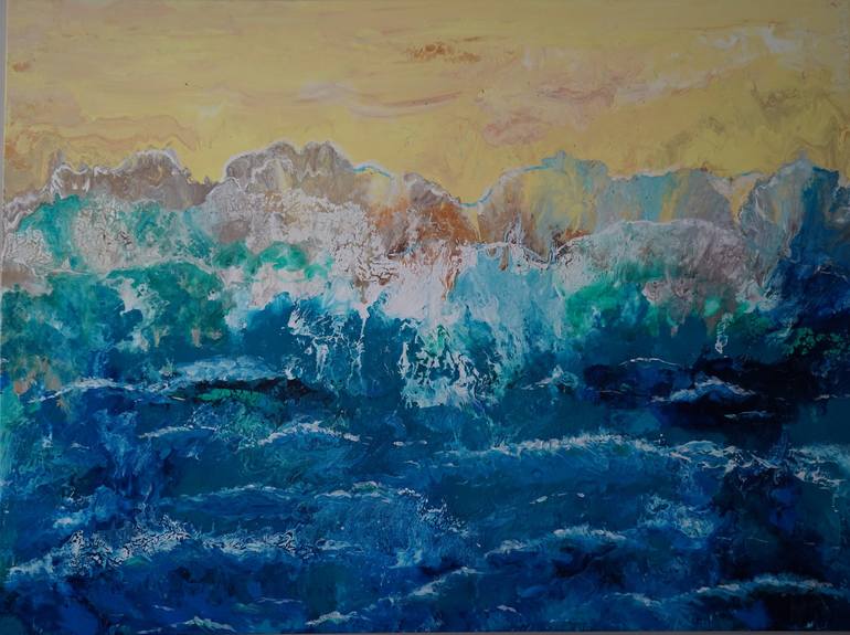 The picture was made during the quarantine. Its a dream about ocean beach, you can look at it from a birds eye view, you can feel the wind and smell of the ocean. The beach is empty and waiting for people. The texture is thicker in some places then in others. The picture is covered with glossy varn...