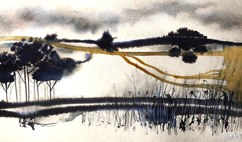 'Ochre Shadow' - By Cherianne Dawn B.A (Hons), MioEE "This mixed media image has multiple perspectives, I like the path line quality of the thread of colour, quite map like. But, in a different light,the paths become the long cast of a tall tree, over shadowing our field of view. The bushes at the ...