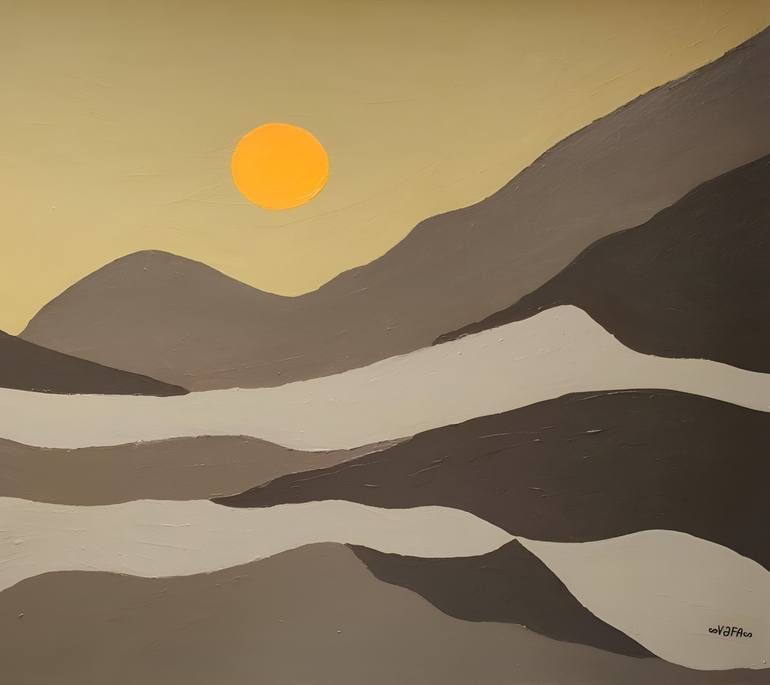 Viewers are invited into a mesmerizing vista where reality dissolves into the dreamlike. The canvas with a serene palette composed of soothing browns and the warm embrace of ochre, harmoniously blending to create an atmosphere of tranquility. Rising majestically in the background, the brown mountain...