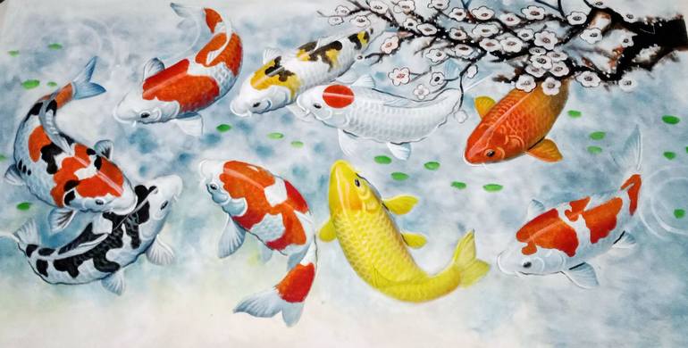 This fantastic oil painting depicts a group of colorful koi fish swimming in a pond with a blooming cherry blossom tree in the background. The artist has captured the beauty and grace of these fish in a serene and peaceful setting. The painting has a dreamy and peaceful atmosphere. This paintin...