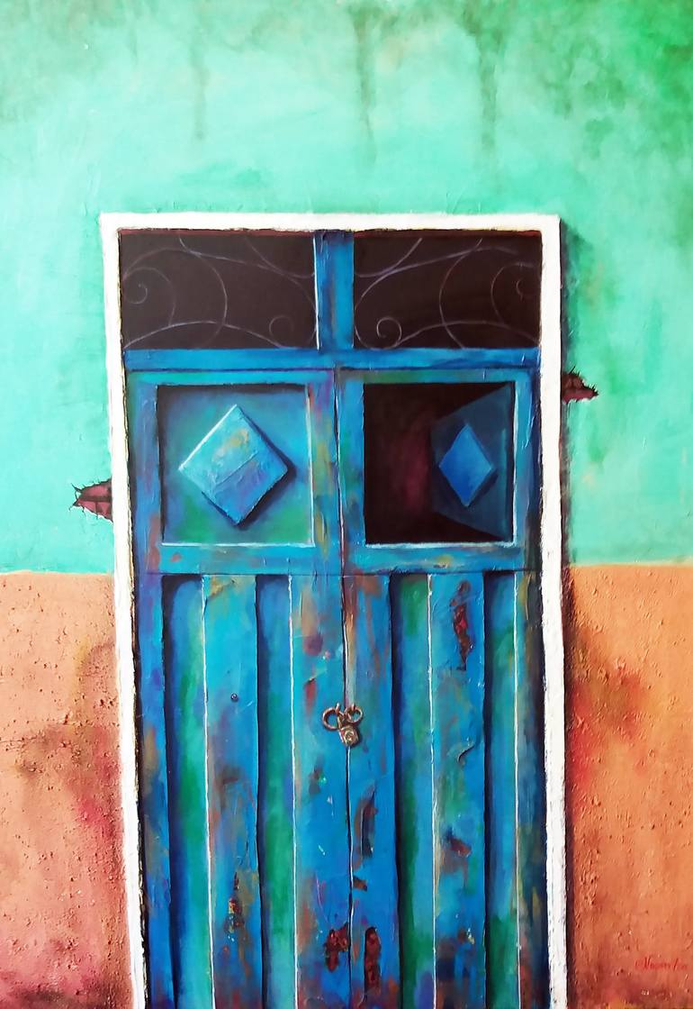 Colonial Gateways Series Mingled in turquoise, light brown and blue stands an old doorway against a neat wall. The artist has skillfully added water marks of dampness to enhance the realistic effect of the its exposure. The detail of the door and brightness of hues combined to inject an atmosphere ...