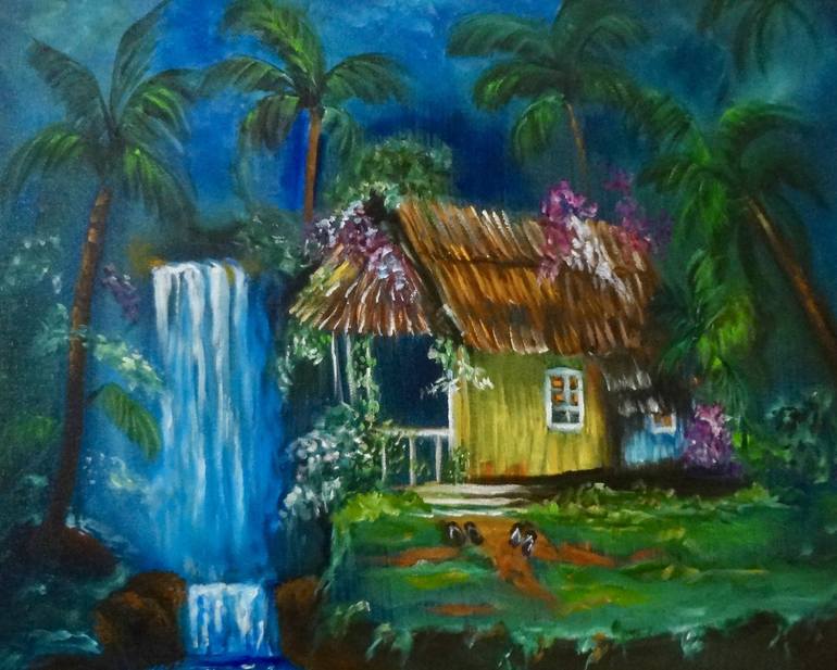 Original oil painting on canvas with frame ready to hang. Old Hawaiian hut in the palm trees. waterfalls by the homestead. Slippers by the door