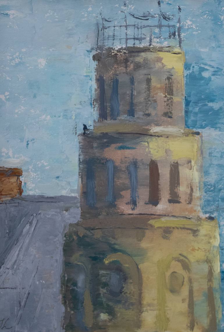 A tall cylindrical tower rises against a softly textured sky, painted in a palette of warm ochres and cool blues. Layers of thick paint suggest a time-worn facade and hint at ongoing restoration or transformation. The composition captures both the grandeur and the patina of an old architectural land...