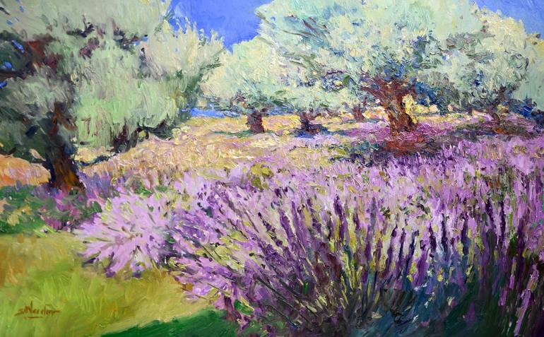 Soft turquoise-green shades of olive trees are in color harmony with lavender flowers. Together they create a peaceful Mediterranean vibe. Impasto brushstrokes and thick texture make the painting very dynamic. The artwork is painted on oil-primed canvas, stretched on wooden bars. It has a wire on th...