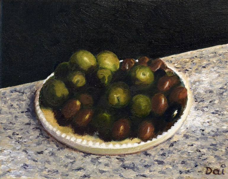 A selection of olives - green, brown and black - on a white porcelain plate with a scalloped edge. Oil painting on stretched linen. 20.3 cm high by 25.4 cm wide by 2 cm deep.