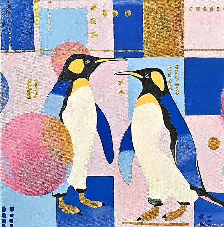This abstract geometric acrylic painting on canvas celebrates a whimsical penguin couple, drawing inspiration from the vibrant and expressive style of Henri Matisse. The piece incorporates pink and blue geometric patterns alongside gold accents, creating a harmonious blend of color and form. Penguin...