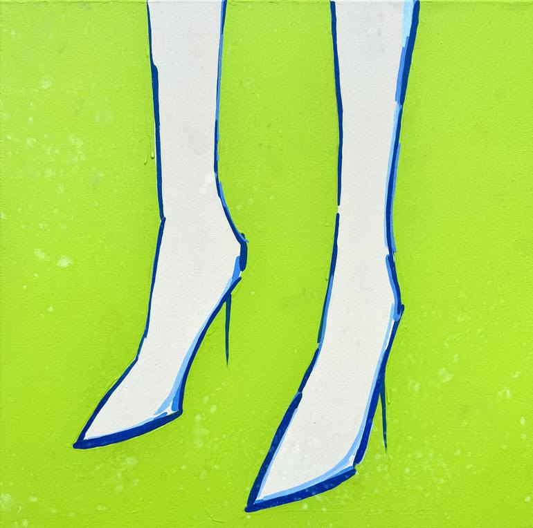 On a 20x20 inch square canvas, a pair of high-heeled legs stand parallel and steady. A bold exploration of movement and elegance, On Ground features sleek, minimalist lines set against a vibrant lime green background. The composition captures the graceful stance of high heels, evoking themes of con...