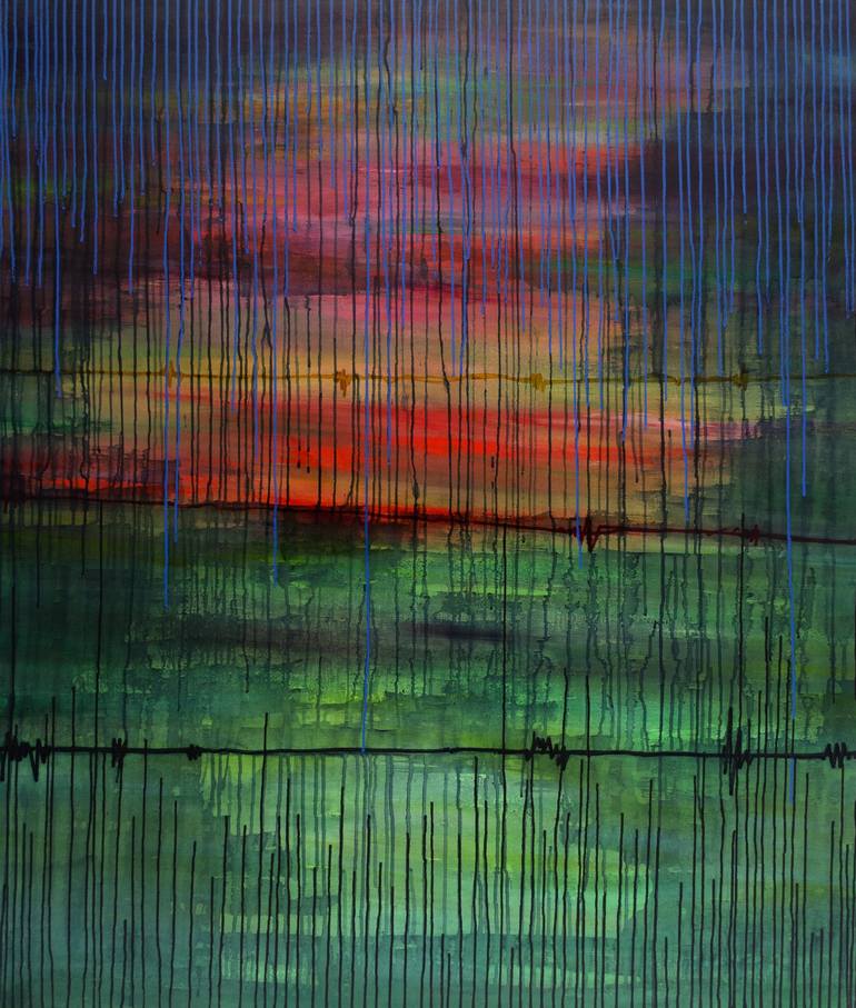 This painting unfolds as a meditative chronicle of migration and memory, distilled through a disciplined yet emotionally charged abstraction. The painting’s deep emerald base anchors the composition, suggesting rootedness and the weight of origin. Above it, a radiant field of red, orange, and yellow...