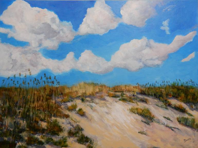 This painting was inspired by a recent walk on Atlantic Beach. I normally photograph the water or the shore and don't pay much attention to what is going on behind me; on this particular day I turned around and saw a beautiful landscape with big, fluffy clouds and sea oats in silhouette.... It is a...