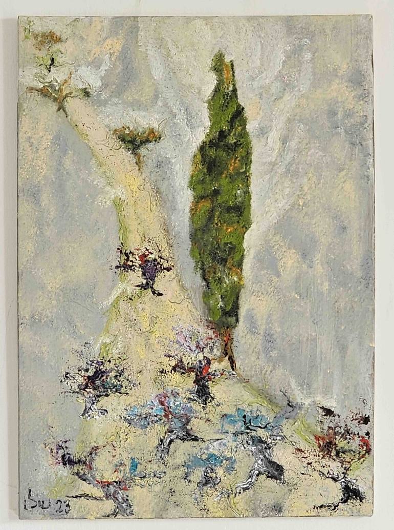 Orchard and cypress, on the way of the pilgrims... mixed technique
