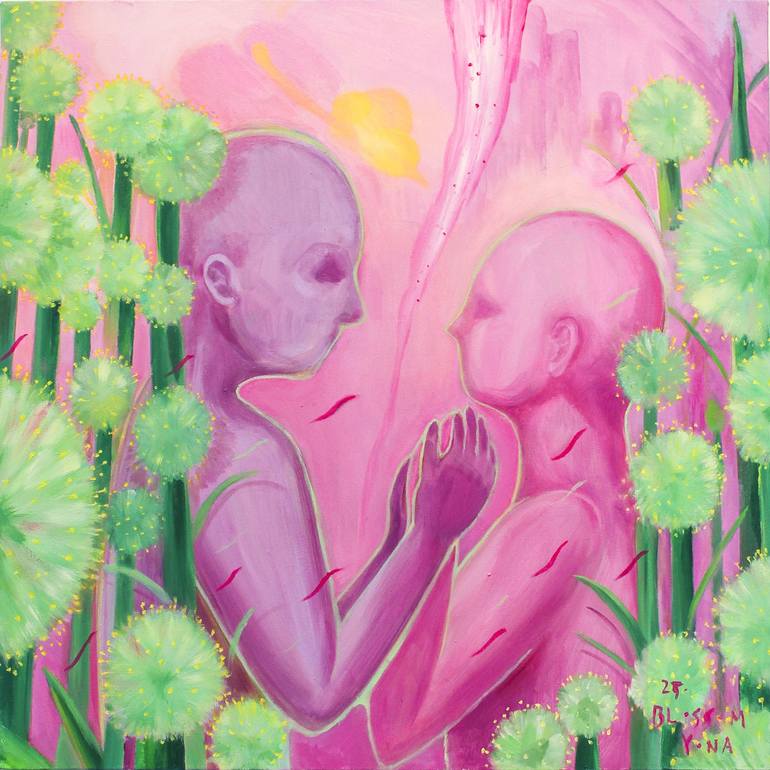 Title: One4 Year: 2025 Medium: Oil on canvas Series: one In the Field of Us is a quiet meditation on love, endurance, and the invisible threads that bind us. Set in a symbolic field of purple-pink mint-hued flowering scallions—a landscape drawn from memories of my mother and formative environment—t...