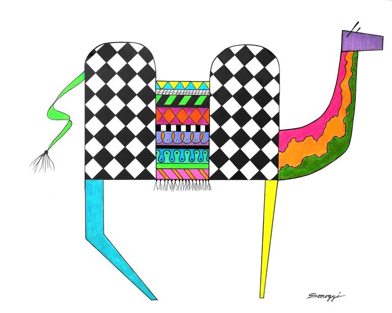 This is a very whimsical, abstract and colorful Bactrian camel (two humps) employing neon colors set off by black and white geometric patterns, which adds a level of sophistication not usually found in very playful, whimsical artwork. This piece is part of my collection that I’m calling “Magical Men...