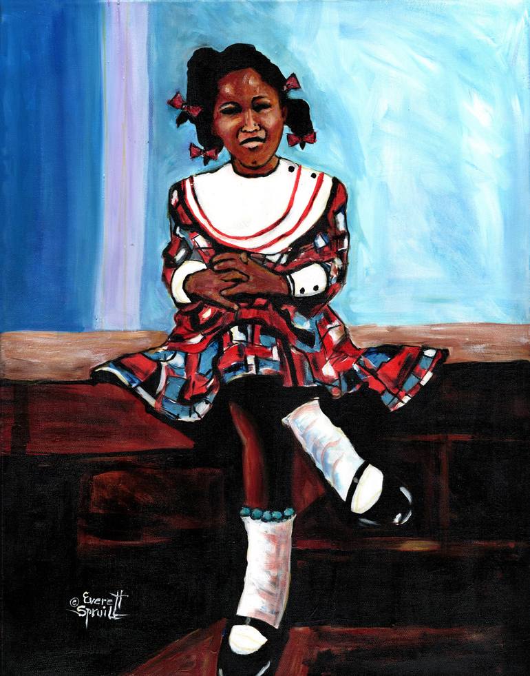 Everett Spruill’s “One Sunday Morning” is a compelling exploration of cultural identity and personal expression. The painting features a young Black girl seated on a bench, dressed in a vibrant outfit. The attire, with its striped top and patterned skirt, is reminiscent of traditional Sunday best, o...