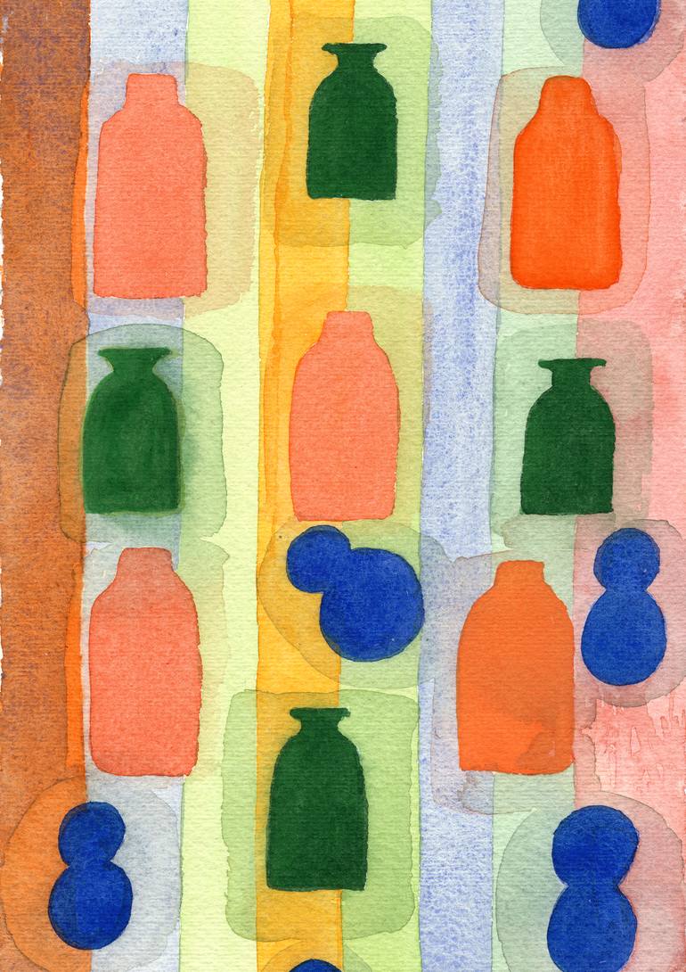 Vases in different shapes and colors are aligned in front of colored stripes. One of them however toppled and lies diagonally to the predominant vertical direction.