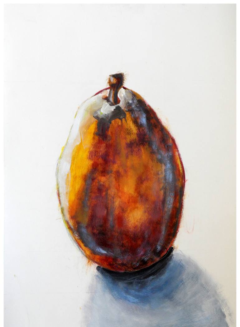 A single pear painted in a free, open style with interpretive color.