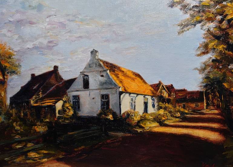 The neighbouring street in the Dutch island village of Hollum, covered in the light of the setting sun in the autumn evening. Oil on canvas 30 x 40 cm, alla prima, limited palette.