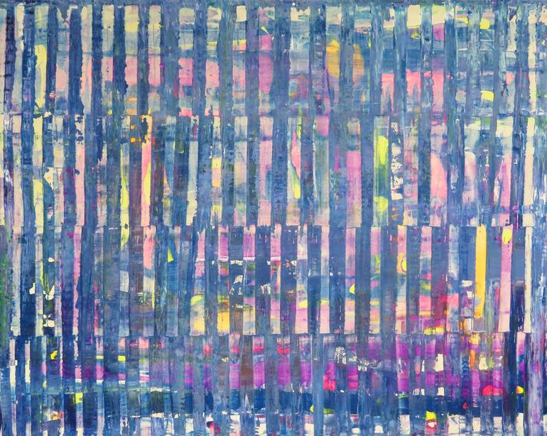 Abstract Expressionist acrylic on stretched canvas. Complex, thin and translucent layers. Side edges are painted. Large format 46" x 58". Stretched, wired and ready to hang for display.