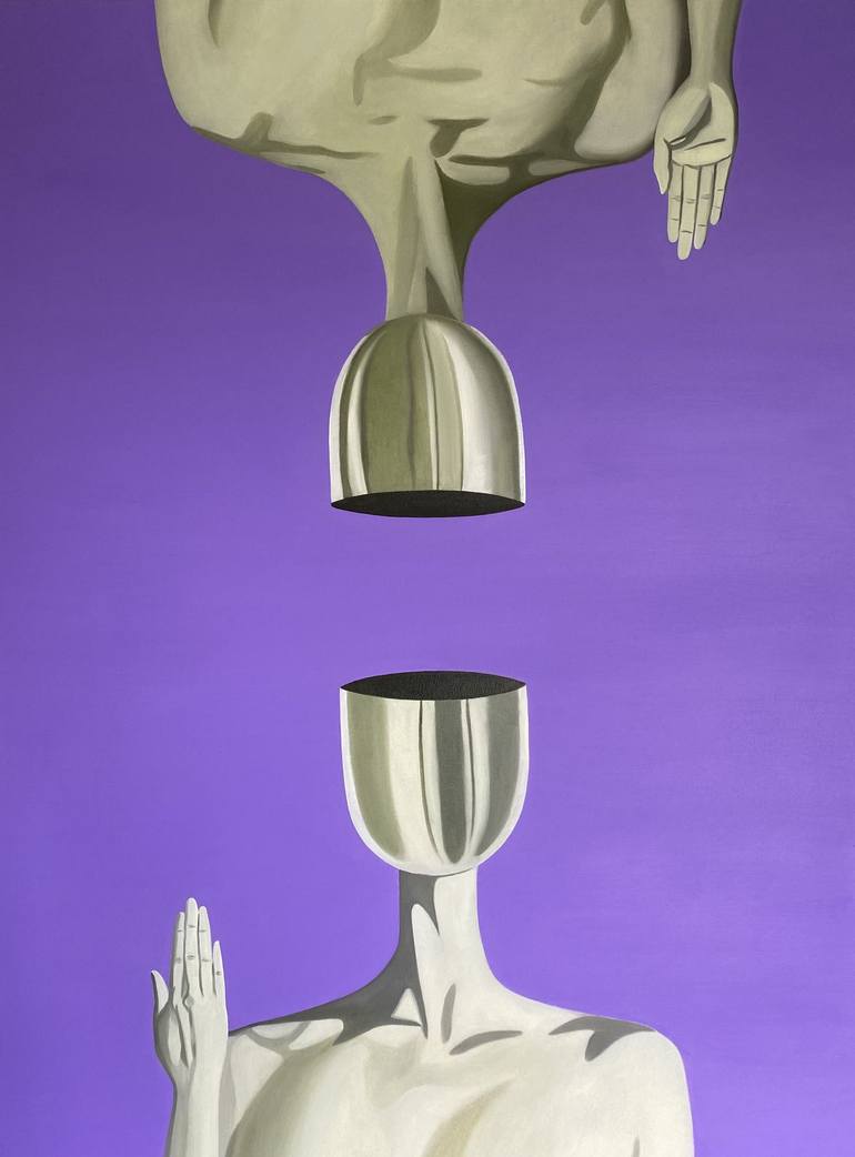 In this painting, two bodies with planter heads are positioned upside down from each other on the canvas, creating a mirrored effect. One of their hands is raised, with one palm facing forward and the other facing backward. This unique composition explores the idea of reflection and duality. The pl...
