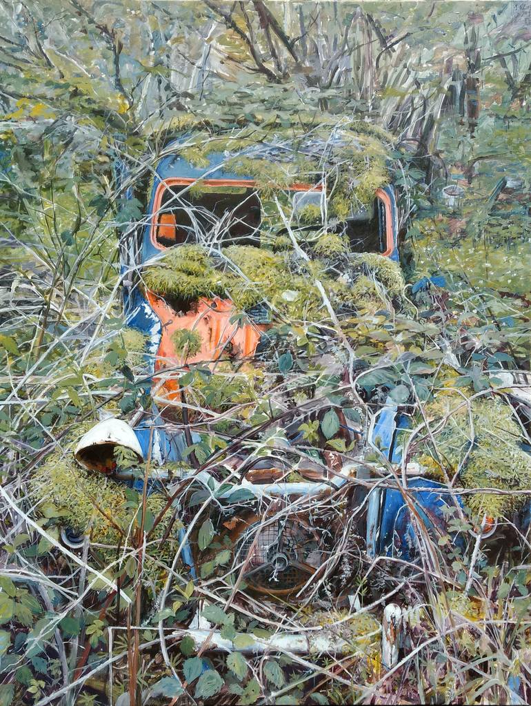 Carcass of lost car at the bottom of the woods ... completely colonized by brambles and mosses everywhere. Almost invisible and which gives to see a very graphic green frame. A kind of "green car" somehow