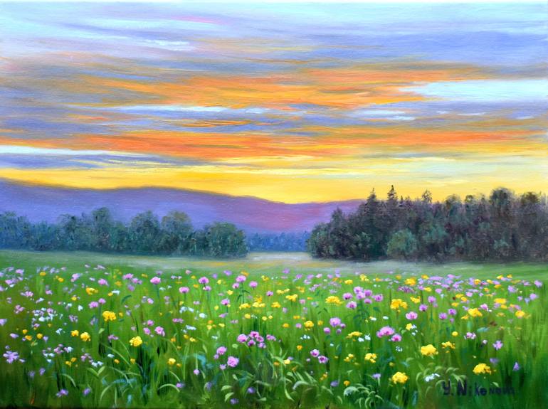 Orange Clouds - an original oil painting on canvas by Yulia Nikonova. Landscape painting with colorful sunset clouds over a meadow with wildflowers. A beautiful colorful accent for your home, bedroom, living room, dining room, entryway, or office. It’s a perfect gift for your family, friends, colle...