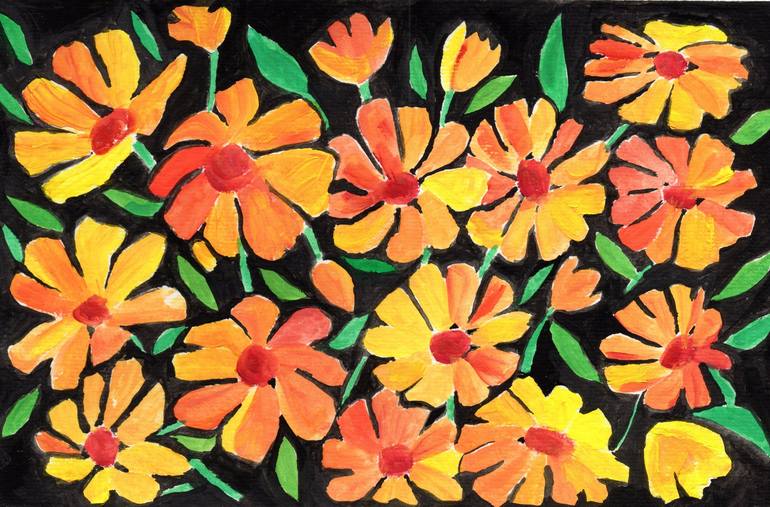 A cheery bed of orange flowers on a black ground, paint on paper.