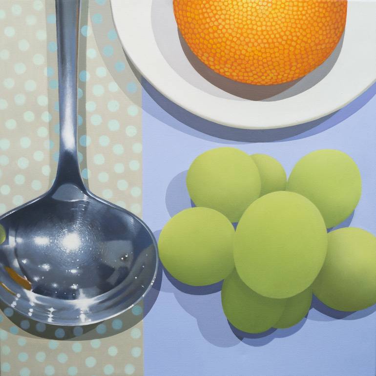 A formal arrangement of an orange on a plate, some grapes and a spoon and a companion piece to Book. Lemon. Spoon. By painting larger than life size, I wanted to open these forms up to become spaces; in the spoon a reflected room, or perhaps a starry night and the orange a large shere, a world maybe...