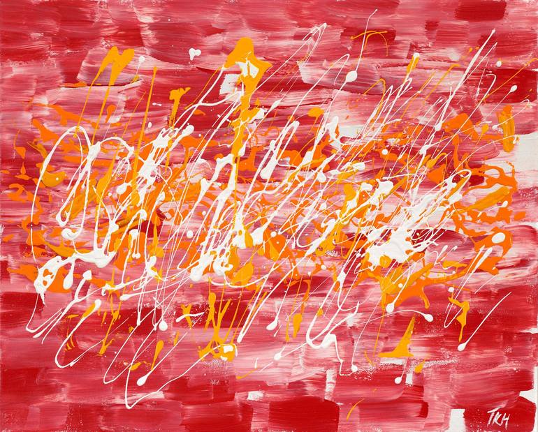 The horizontal and vertical movements inspire me. My brushstrokes move across, activating the canvas, and creating a vibrant red base. I then pour the acrylic oranges and whites with shape and texture to make the colors dance across the canvas. This work is wired, ready to hang, and unframed.