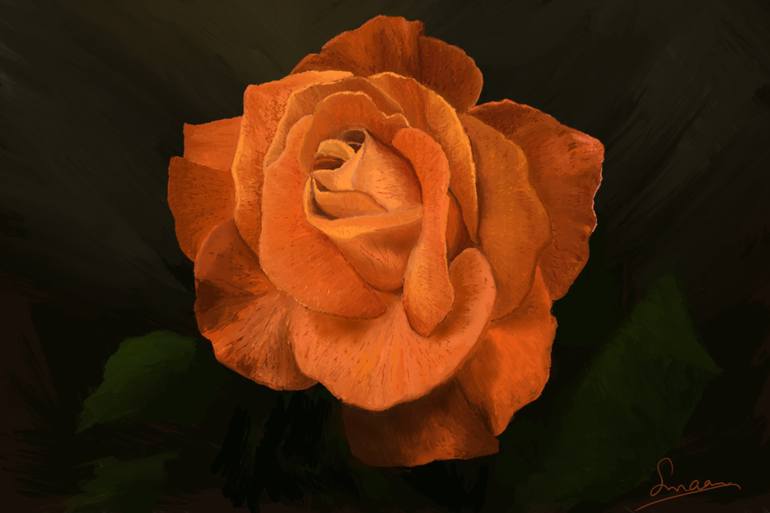 A digital painting of a bright and beautiful orange rose in a dark background with a hint of dark green leaves, done in an oil painting style. The original digital painting is printed on a premium quality canvas using high quality inks and is stretched and stray-laminated and ready to hang. It is a...