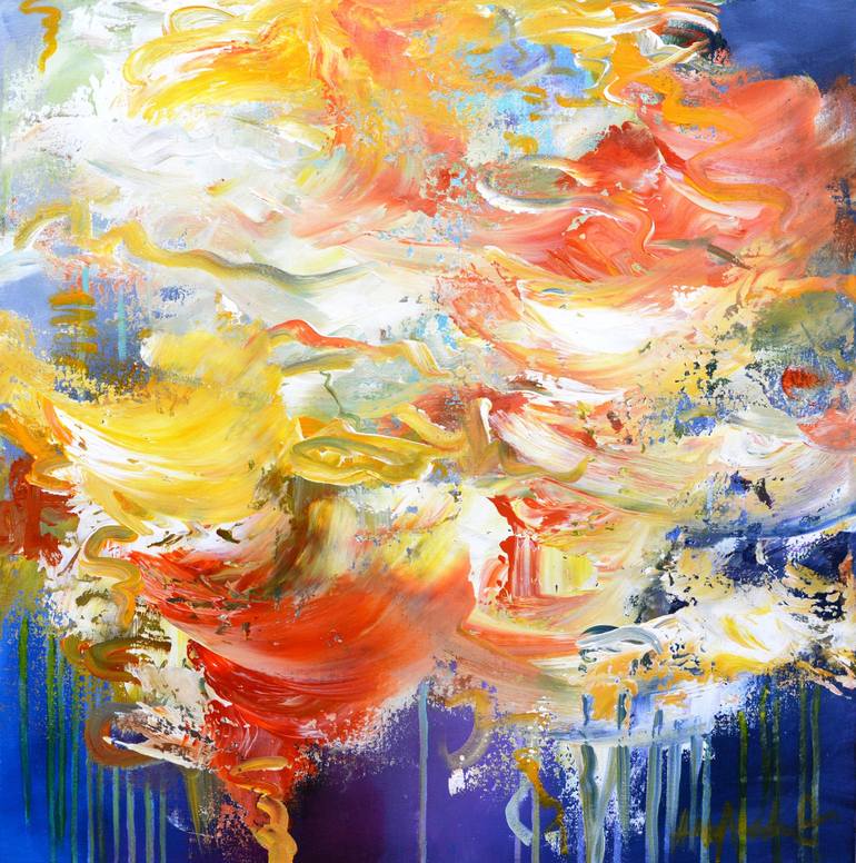Gorgeous abstract original painting on tones of blue, yellow and orange. This is a bold colorful abstract painting, created with energetic brushstrokes and vibrant color for a happy mood. It was created with professional acrylic paint on canvas. Very beautiful in real life. :) - Title: Reflection ...