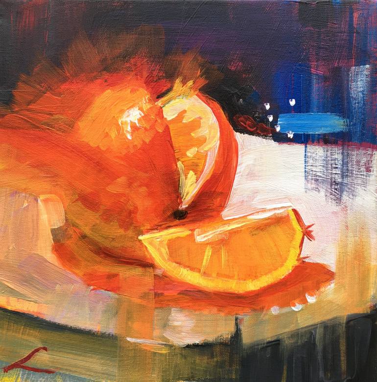 Orange on the plate, painted by oil on canvas with an acrylic underpainting.