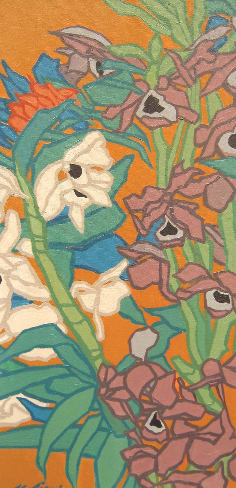 This work depicts Orchids at Glasgow Botanical Gardens. I was entranced by their beauty and colour and wanted to try and capture that. I have gone for a stylised look. Detail continues around sides of deep box canvas- so no need to frame.