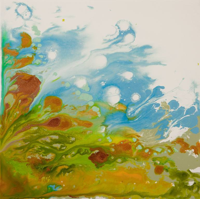Origin of Serenity 4 is an original painting, created with acrylic paint on gallery-wrapped canvas. It has a width of 12 inches and a height of 12 inches with a depth of 1.5 inches (12x12x1.5). The colors used in the painting are white, blue, green, teal, gray, silver, gold, and copper. The edges o...