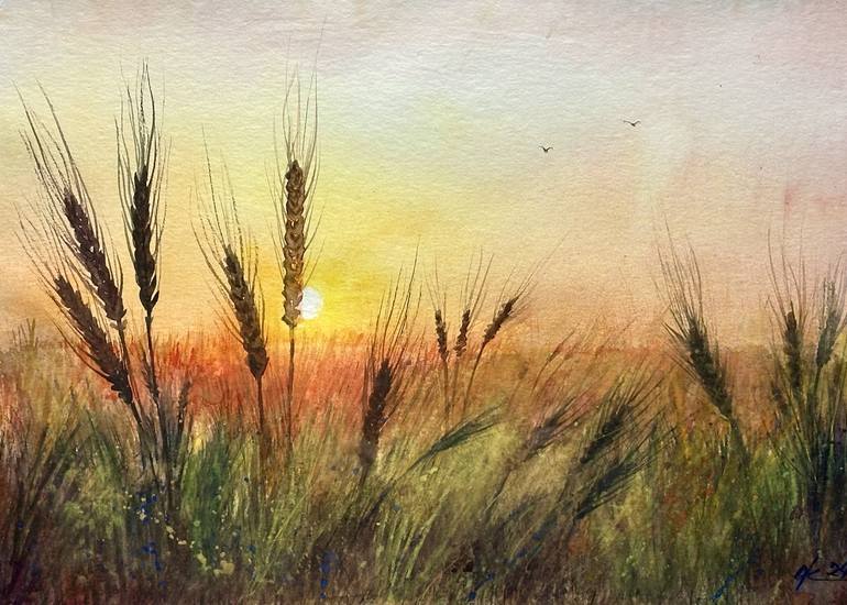 This watercolor painting conveys the warm, peaceful atmosphere of sunset over a wheat field. Soft, blurry brushstrokes create a feeling of lightness and airiness inherent in this time of day. The golden and amber shades of the wheat harmoniously combine with the deep orange-pink highlights of the s...