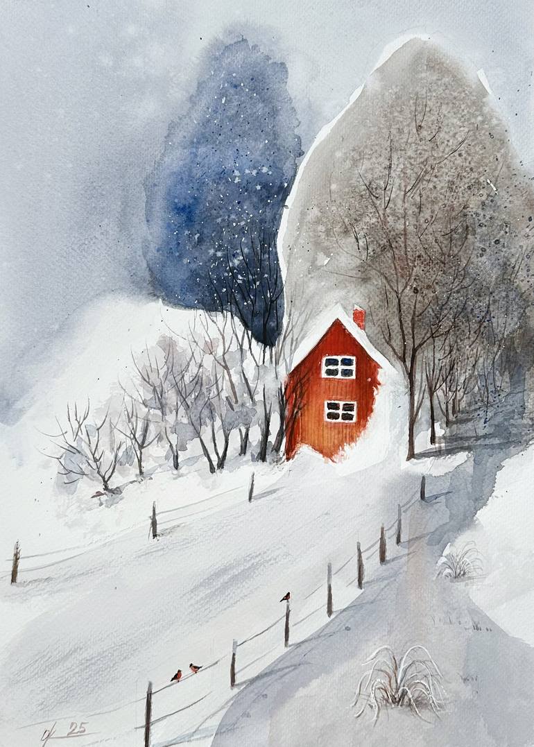 The watercolor depicts a calm winter day, filled with lightness and freshness. The central place is occupied by a snow-covered road stretching into the distance. Its surface reflects gentle blue and lilac shadows, creating the impression of fresh, fluffy snow. The red house with a snow-covered roof ...