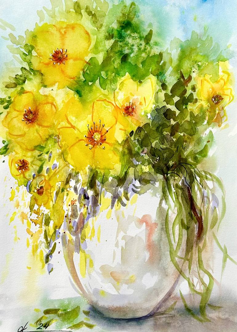 The painting conveys lightness and airiness through a semi-abstract style. Yellow wildflowers bloom in a white vase, their silhouettes softly defined, with individual strokes creating a sense of movement and vitality. The bright yellow and golden hues of the flowers contrast beautifully with the del...
