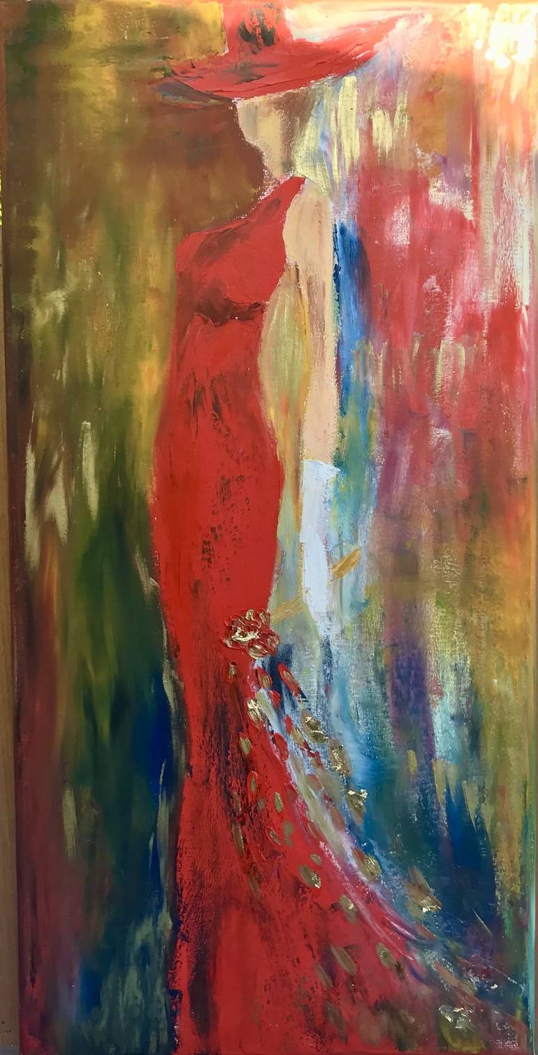 My hobby is oil painting, oil for me is a living material for creativity, a girl in a red dress with a golden rose in her hand, there is a lot of red, yellow in the picture, these colors of love, desire, they pass into each other, dimensions are 25 by 50 cm, the picture is bright modern, painted wi...