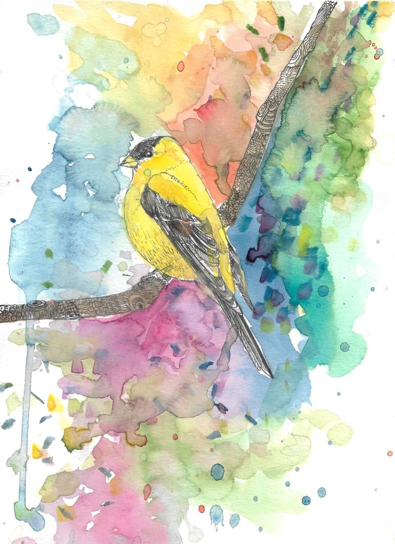 Another original watercolor painting of a beautiful yellow bird Oriolus. Its yellow feather goes well with all colors. It reminds me of a rainbow.