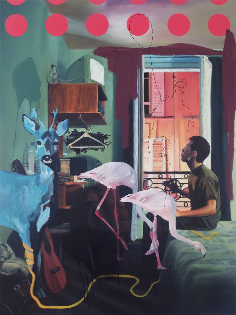In February 2005 I stayed with a friend in a Hotel in Paris. This is the starting point of this painting. With surreal and abstract elements I expand this base situation and increased so the level of narration. There are symbolic connections between the real situation pictured in the painting and th...