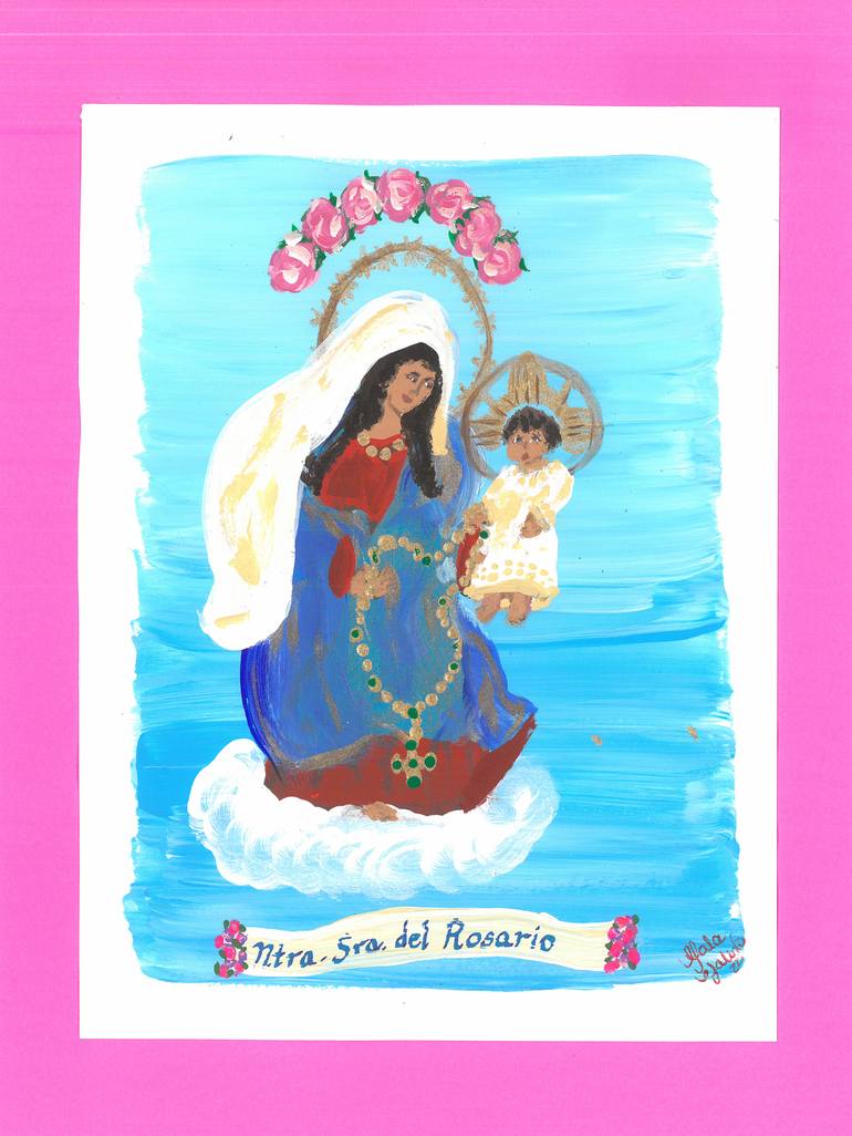 This is a portrait of Our Lady of the Rosary. The catholic tradition of using the rosary for prayer is attributed to Our Lady of the Rosary. Legend has it that in 1206, St. Dominic received a vision of the blessed Virgin Mary carrying a rosary which she gave to him and taught him how to use it for p...