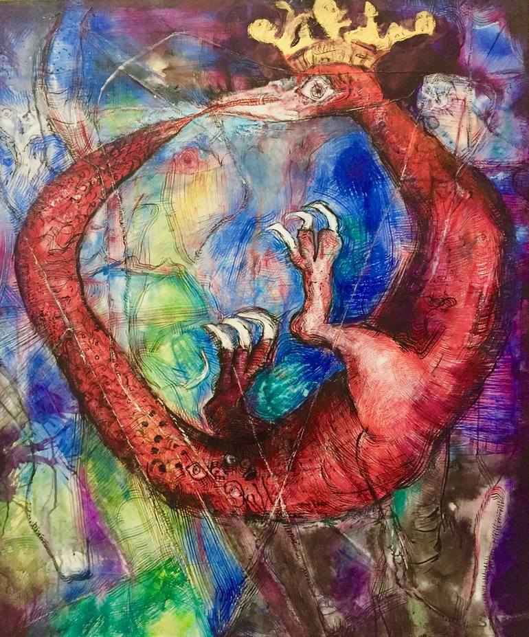 Ouroboros is the snake that eats its own tail. The image appears in numerous cultures throughout history and the world, signifying the eternal life force that is both creative and destructive. Here this great mythic figure is the crowned ruler of his immediate environment. To dream or hallucinate th...